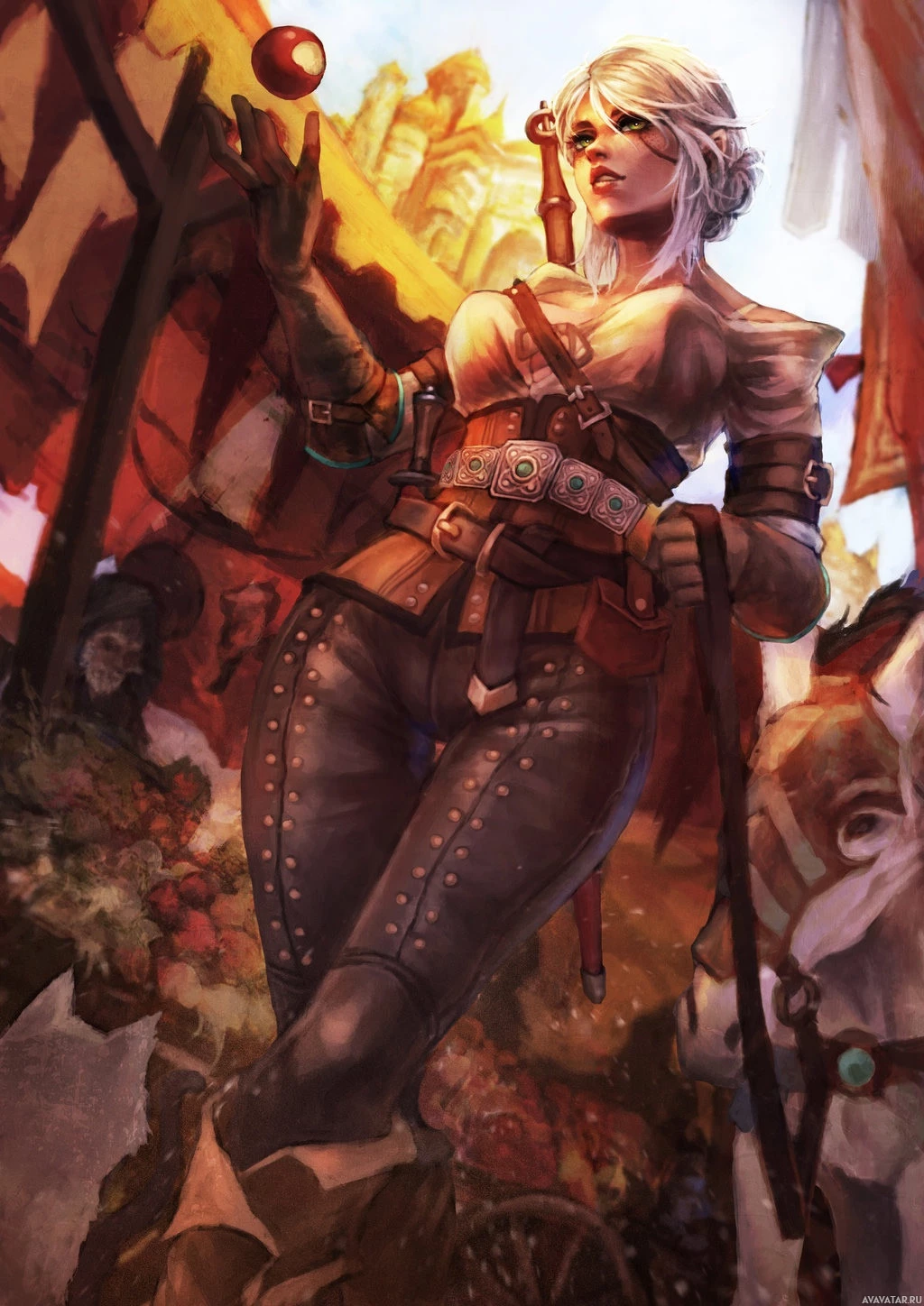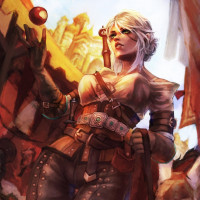 a female character from the "The Witcher" game series. This character is known as Ciri, and she is depicted in her armored outfit with weapons and