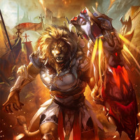 The image depicts a fantasy character that appears to be a mutant lion-like figure. The character is wearing armor and wielding a weapon, suggesting they are ready for battle or adventure. The background has an intense and chaotic atmosphere, possibly indicating conflict or warfare.