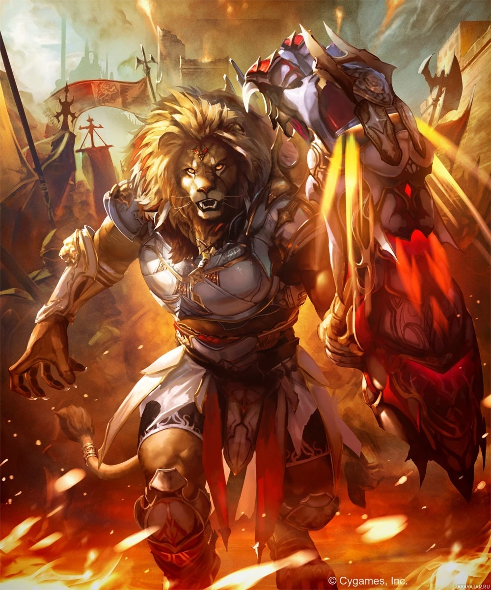 На картинке изображен фэнтезийный персонаж, который кажется мутантной львиной фигурой. Персонаж носит доспехи и носит оружие, предполагая, что он готов к битве или приключениям. Фон имеет интенсивную и хаотичную атмосферу, что может указывать на конфликт или войну.