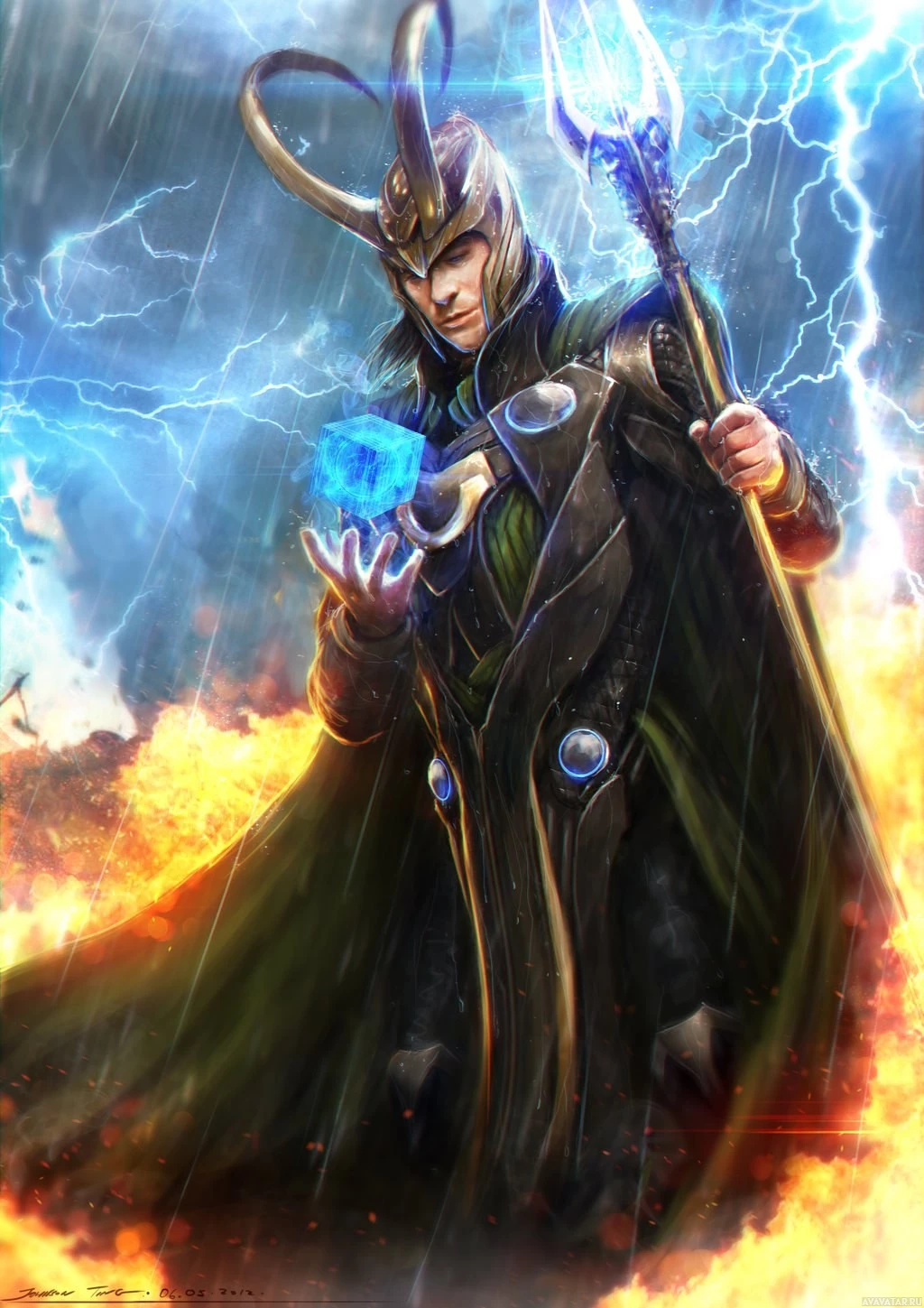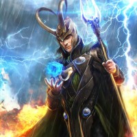 flowing hair, a confident expression on his face, and is holding a staff that emits lightning bolts. He's also wearing a cape that appears to be on fire in the background, which adds