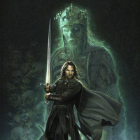 the Rings universe, specifically depicted as Aragorn. He is holding a sword and stands in front of what appears to be