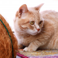 a moving object or sound that has caught its attention. There is a round, textured object with a handle behind the cat, which might be
