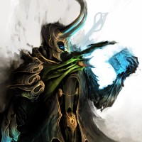 a dynamic pose, holding a blue energy sphere in his hand and wearing a helmet with two horns on top, which are traditional elements of Loki's portrayal. The character is styled in a fantasy or comic book art style, with intricate details suggesting a blend of historical and magical influences.