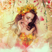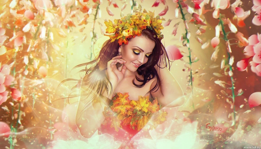 autumn leaves arranged around her head, giving her an ethereal or natural look that might suggest a connection to nature or the season of autumn. There are