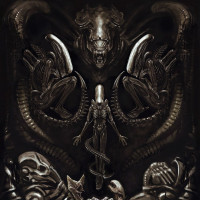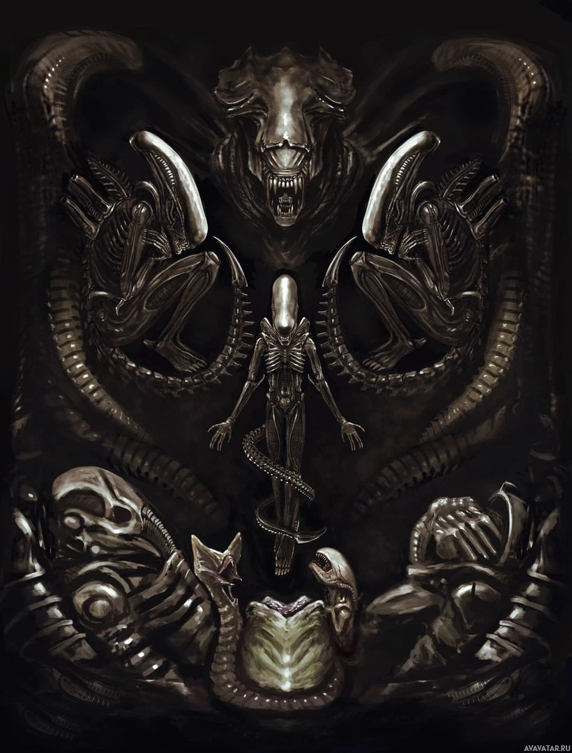 The image depicts a stylized representation of the Xenomorphs, also known as Aliens, from the "Alien"