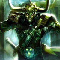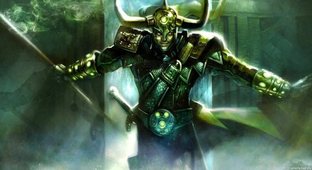 the Norse god of mischief and trickery. He is wearing armor with