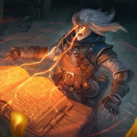 a warm glow on the scene, enhancing the fantasy element of the artwork. The character's pose and expression suggest concentration and intensity as they engage with their surroundings and whatever activity they are conducting.