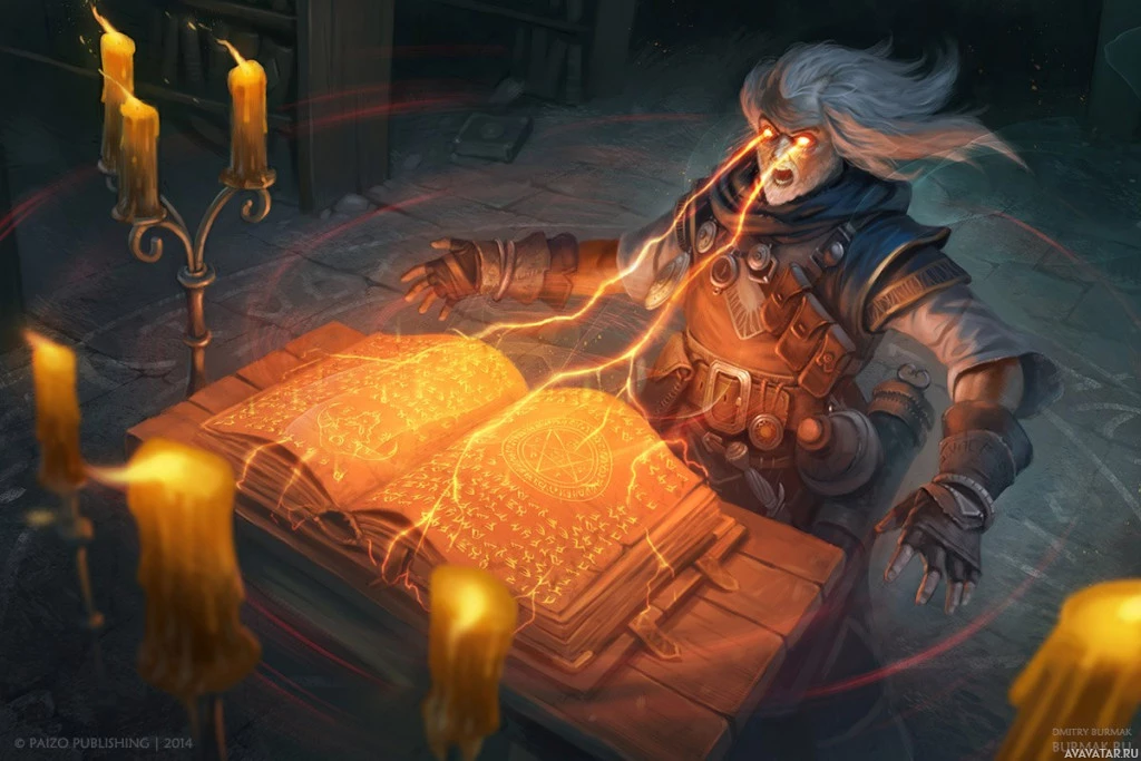 various candles around, suggesting a magical or mystical setting. The character is holding a book open and seems to be in the middle of performing some
