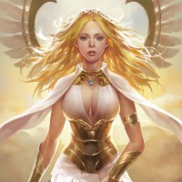 blonde hair and is wearing a white dress with gold accents, suggesting a divine or heavenly appearance. Around her neck, she has