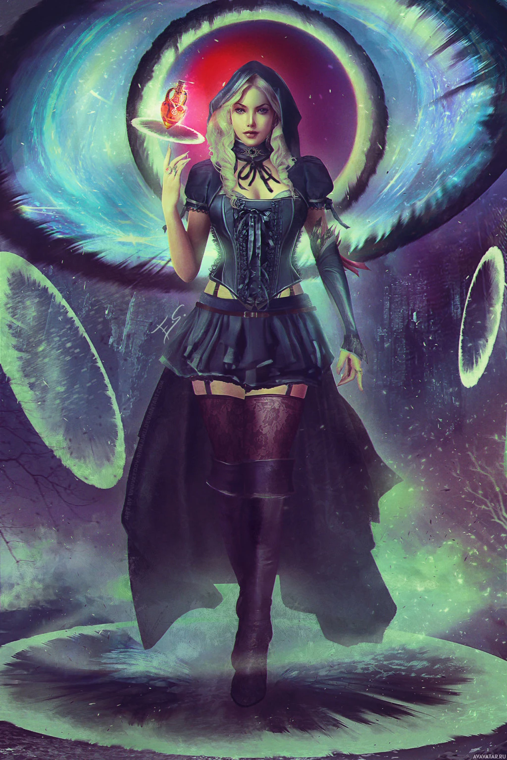 The image depicts a fantasy-themed character that appears to be inspired by a magical or otherworldly setting. The character is wearing a black gothic-style outfit with a hood and a skull design on the front, suggesting