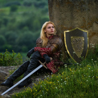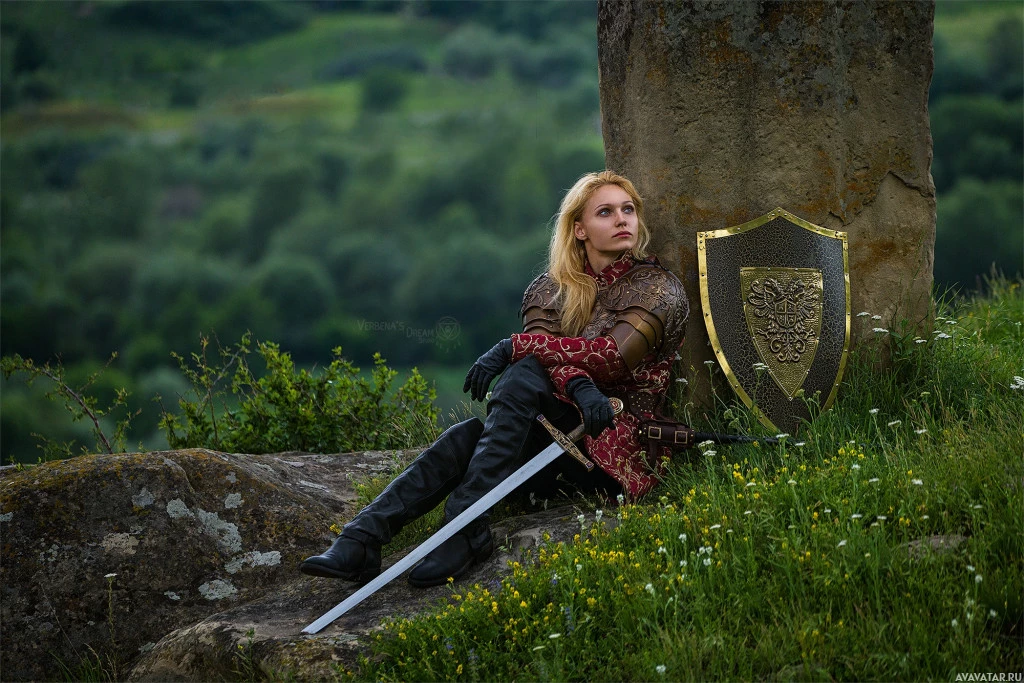 a rock formation, which has a shield emblem attached to it. She is holding a sword in her hand and resting her elbow on her knee as if posing for the photograph. The setting suggests an outdoor location with
