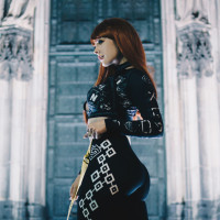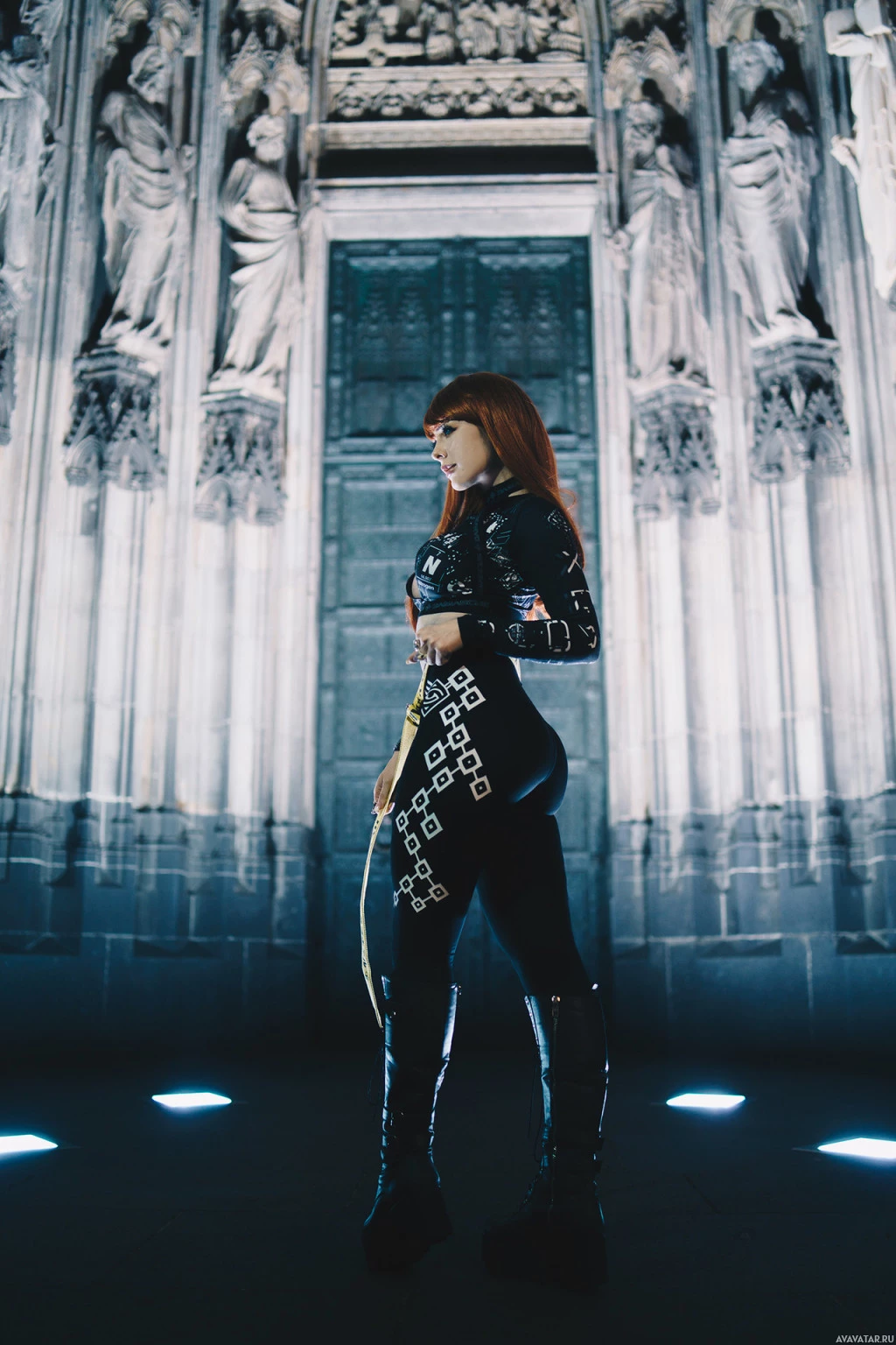 red hair and is wearing a black outfit with visible textures, which may suggest it's a leather-like material. The lighting gives the image a somewhat dramatic and moody atmosphere.