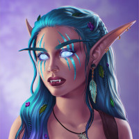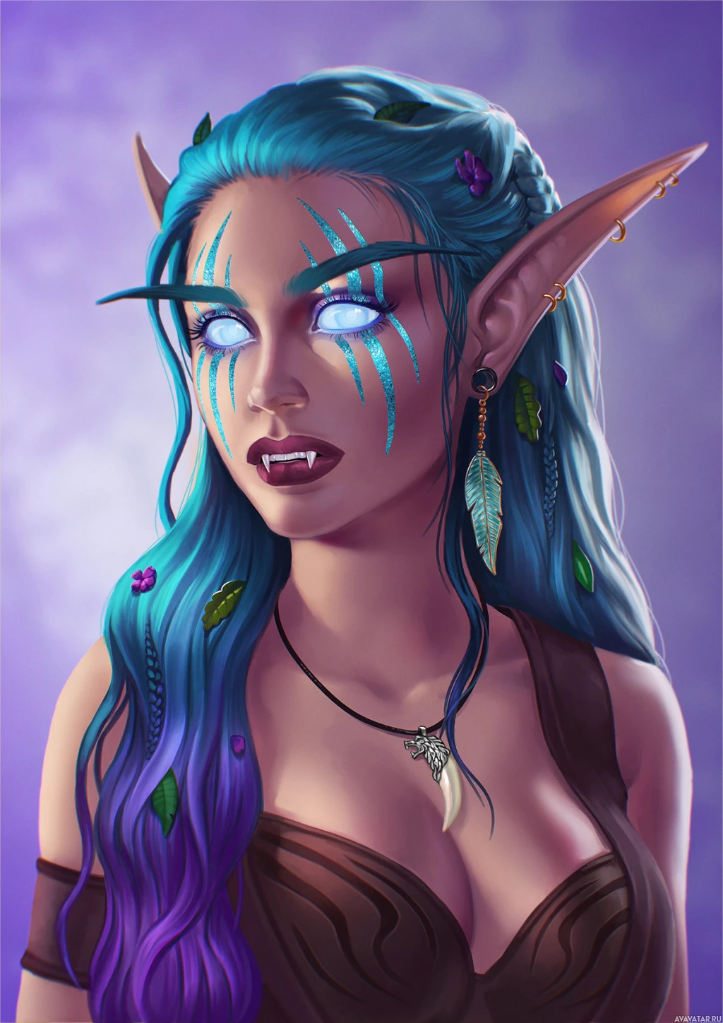 blue hair, pointed ears characteristic of elves, and is adorned with various accessories such as earrings, bracelets, and a necklace. The art style is vibrant and detailed, giving the character an intense and mystical look. This image could be associated with