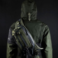green jacket with the hood up. There is a backpack on their back, and it appears to be equipped with some sort of harness or straps, possibly for carrying