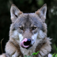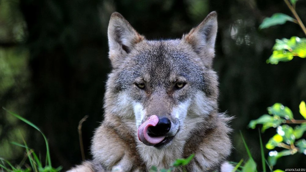 the artificial background and its behavior of licking its nose which might indicate it's licking itself. Wolves are known for their pack structure and