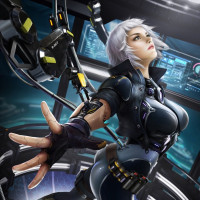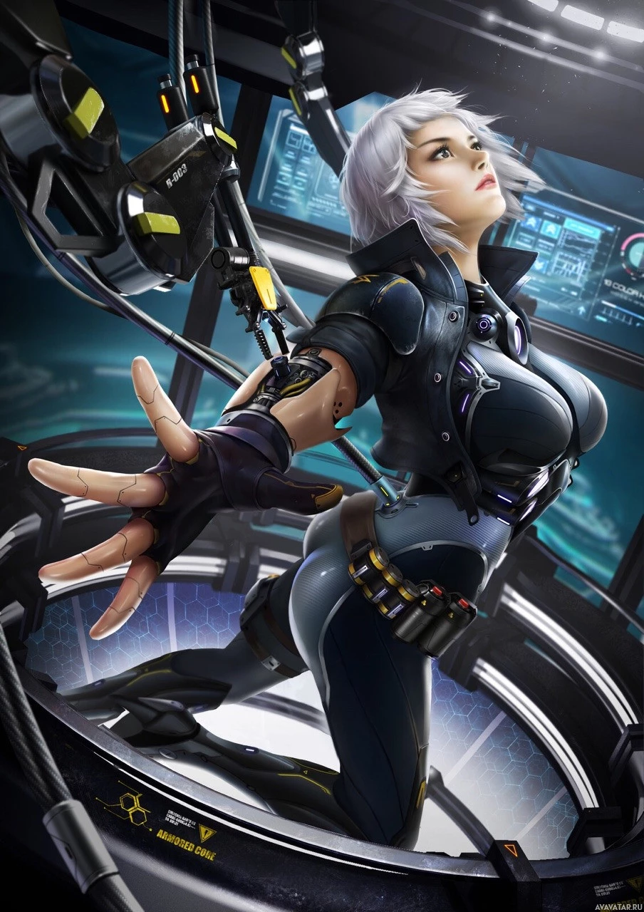advanced technology or exploration. The environment around her looks like it could be the interior of a spaceship or a high-tech