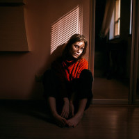 an interior space, likely a home, given the presence of closed blinds on a window that let in sunlight, creating a warm atmosphere. The person's posture and the overall composition give the image a contemplative or introspective feel.