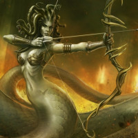The image depicts a fantasy-themed illustration of Medusa, the Gorgon from