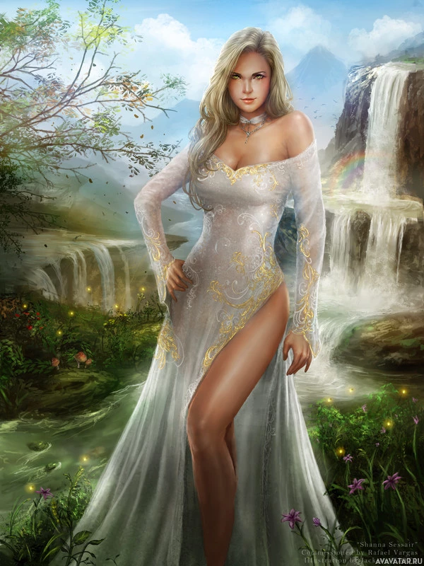 a natural landscape with waterfalls and trees, suggesting a magical or mystical environment. The character's expression and pose convey