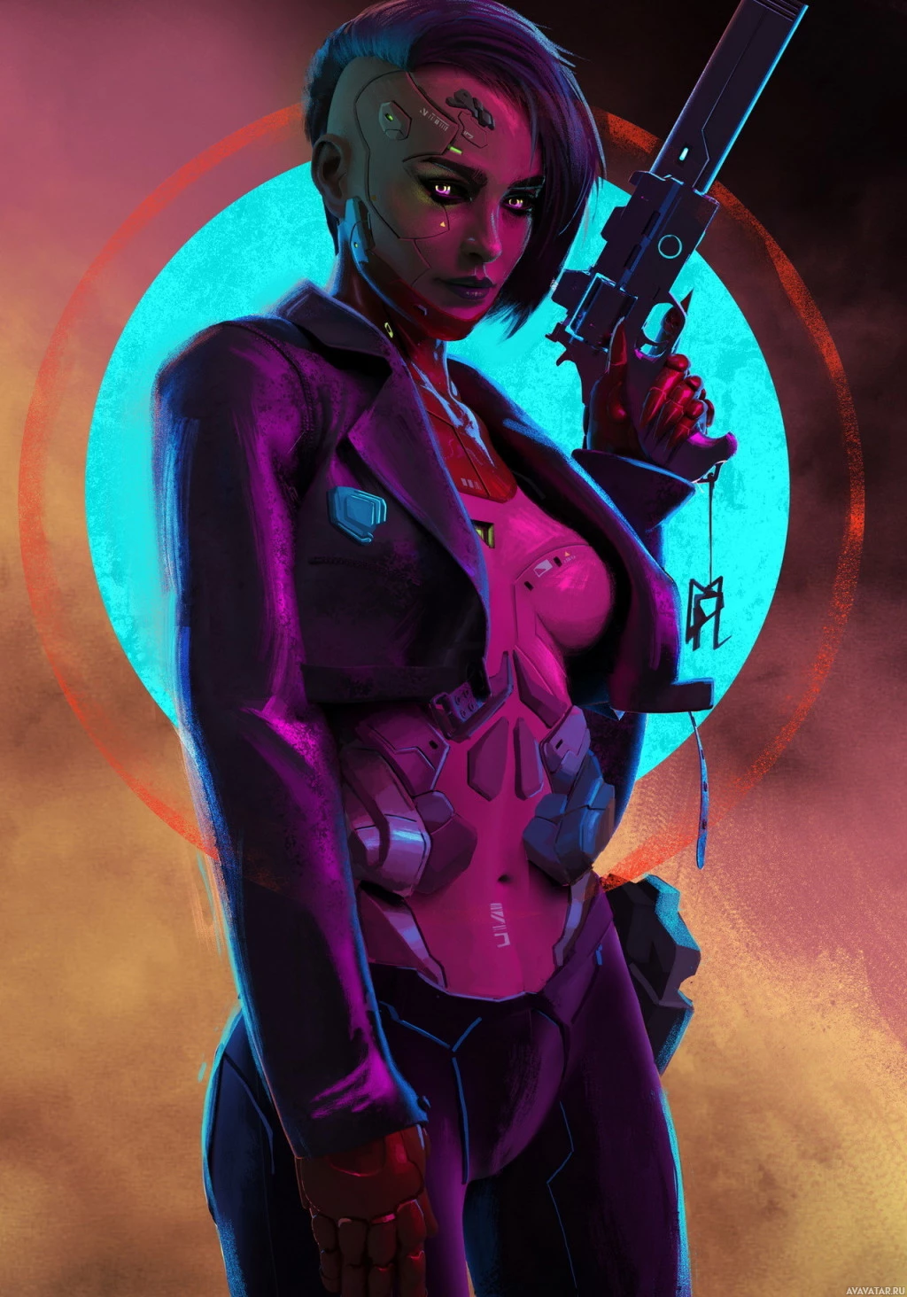 Картинка показывает иллюстрированного персонажа, который кажется роботизированным или кибернетически улучшенным человеком, обычно связанным с темами научной фантастики. Этот персонаж держит пистолет и настроен на яркий, футуристический фон с неоновыми огнями.
