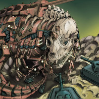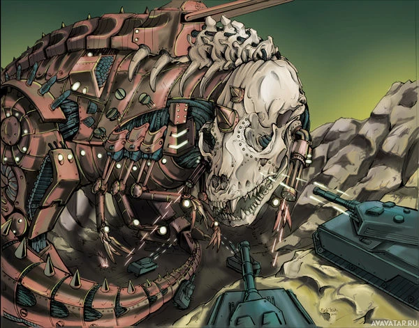 a skull for a head. This robot has mechanical structures and appears to be heavily armed, indicating it might be