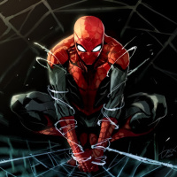 a spider web, which is consistent with the iconic logo of Spider-Man's costume. He is holding his hands up as if he's defending himself or preparing for action. The overall tone of the image suggests a dynamic and intense scene, possibly from a comic book or