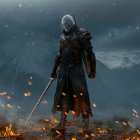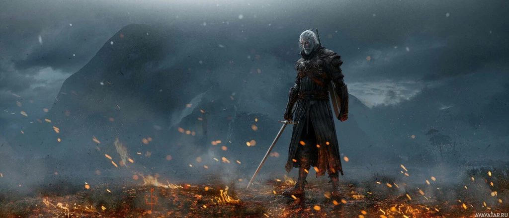 На картинке изображена сцена из «Ведьмака 3: Дикая Охота», в которой фигурирует Геральт из Ривии. Он стоит среди поля боя с огнем и дымом вокруг него, что указывает на хаотичный или напряженный момент в игре.