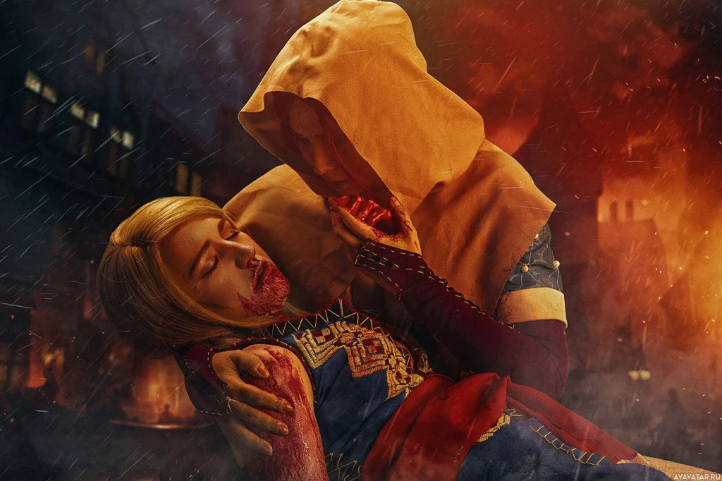 a seated character who seems to be injured and bleeding. The setting looks like a battle-scarred landscape with a dark,