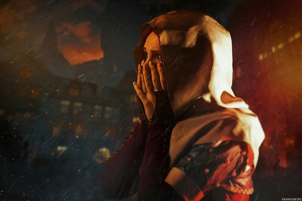 cosplay activity, dressed as one of the characters from the game or show. The background is dark and moody, which fits