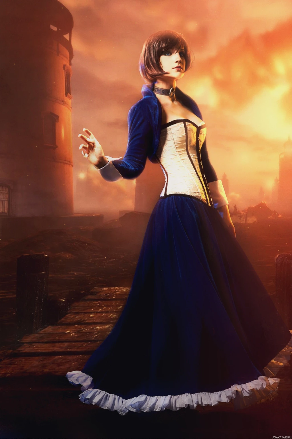 a blue dress, white collar, and what appears to be a corset or ribbon tied at her waist. The background suggests a desolate,