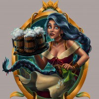 a red outfit that resembles traditional tavern attire. The art style is reminiscent of fantasy illustrations, suggesting the character might be from a role-playing game or fantasy setting where such attire would be common.