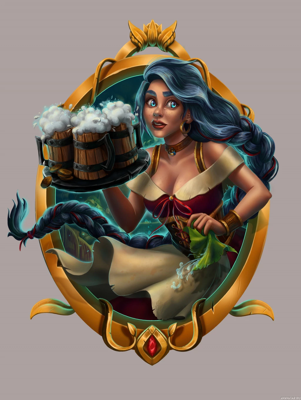 blue hair. She appears to be holding two large mugs of frothy drinks, which could be interpreted as beer or another foamy beverage, and she is wearing