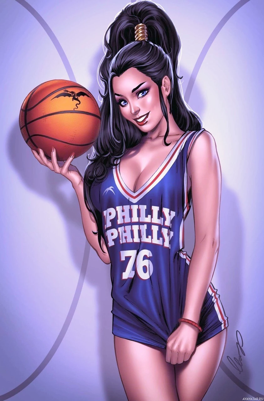 a young woman dressed in sportswear, wearing a Philadelphia 76ers jersey. She is holding a basketball and has a playful or seductive smile on her face. The background is simple with