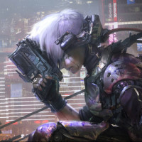 purple hair, wearing a sleek robotic armor. 2B appears to be in