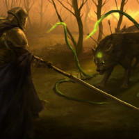 a fantasy scene featuring two warriors in armor and helmets, engaged in combat with several wolves. The setting appears to be