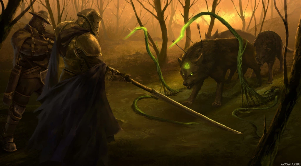 an enchanted forest or battlefield, with the ground covered in mist and the trees around them are twisted and gnarled, suggesting a mystical or otherworldly environment. The lighting is dim, possibly indicating either dawn or dusk, contributing to