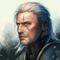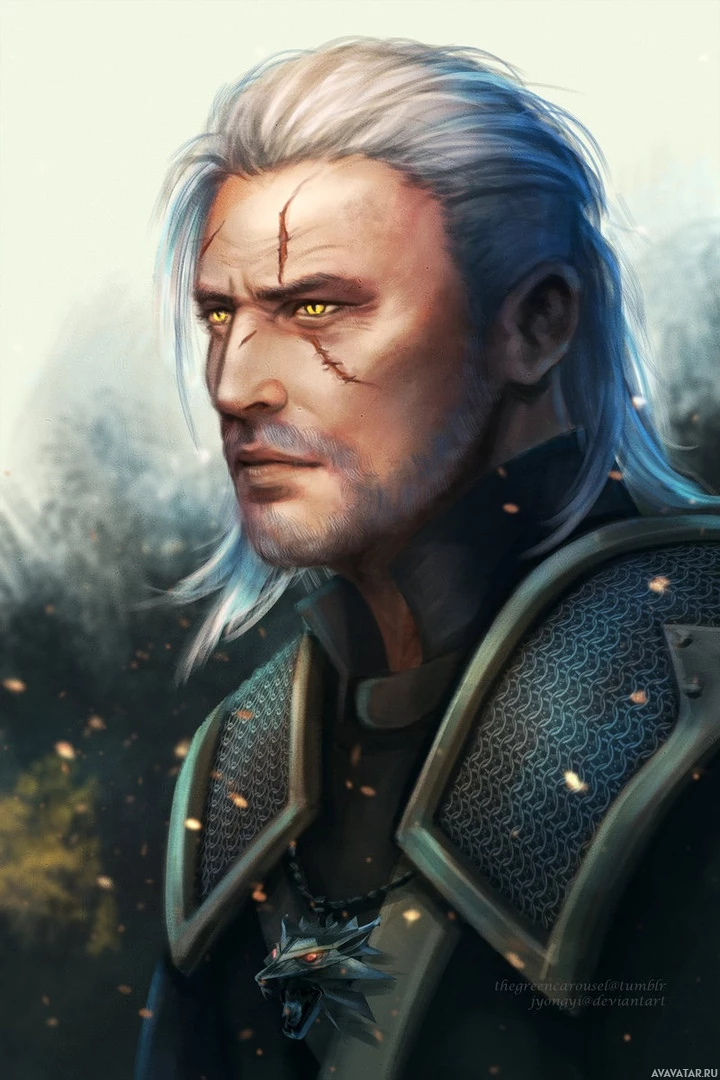 The image features a character known as Geralt of Rivia from "The Witcher"