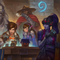 mech suit in the background. To her right, there's Tracer, who is famous for her time-