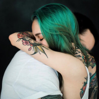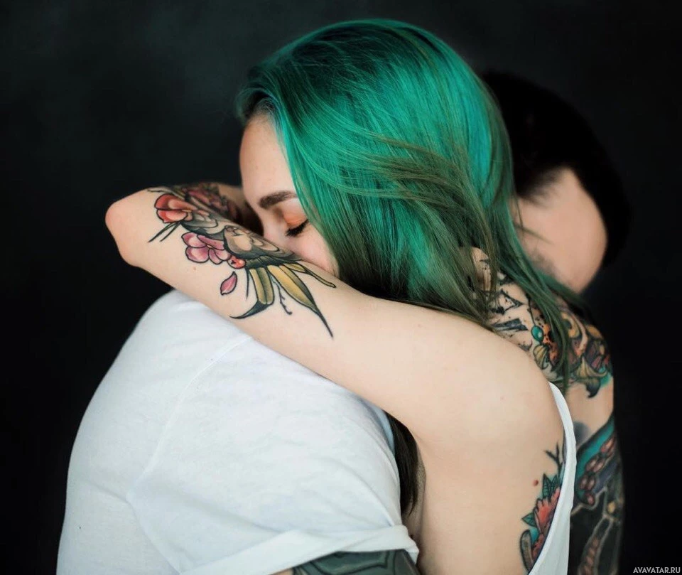 green hair, and the man's arms are wrapped around her from behind. Both individuals have visible tattoos on their arms. The girl's eyes are closed, which may suggest that she is feeling emotions such as love or contentment. The embrace conveys