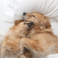 retriever puppies snuggled together, appearing to be sleeping or resting. They are laying on a bed with white pillows and what seems to be a comfortable,
