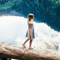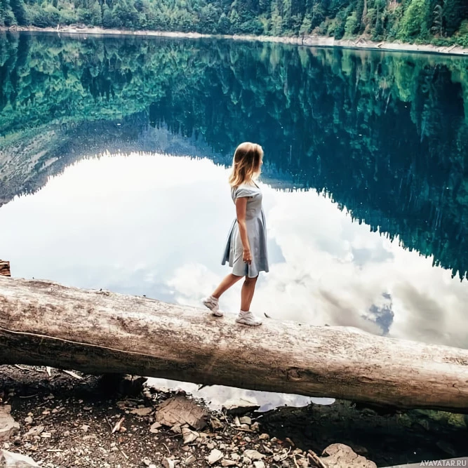 a young woman standing on a fallen tree trunk that extends into water, possibly a lake or river. She is looking out at the calm