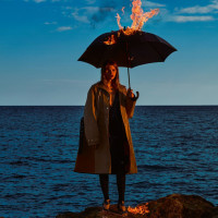 The image shows a woman standing on rocks by the sea. She is holding an umbrella, which appears to be catching fire from flames at her feet. The scene has a dramatic and surreal quality, with the contrast between the calmness of the sea and the fiery destruction in front of her.