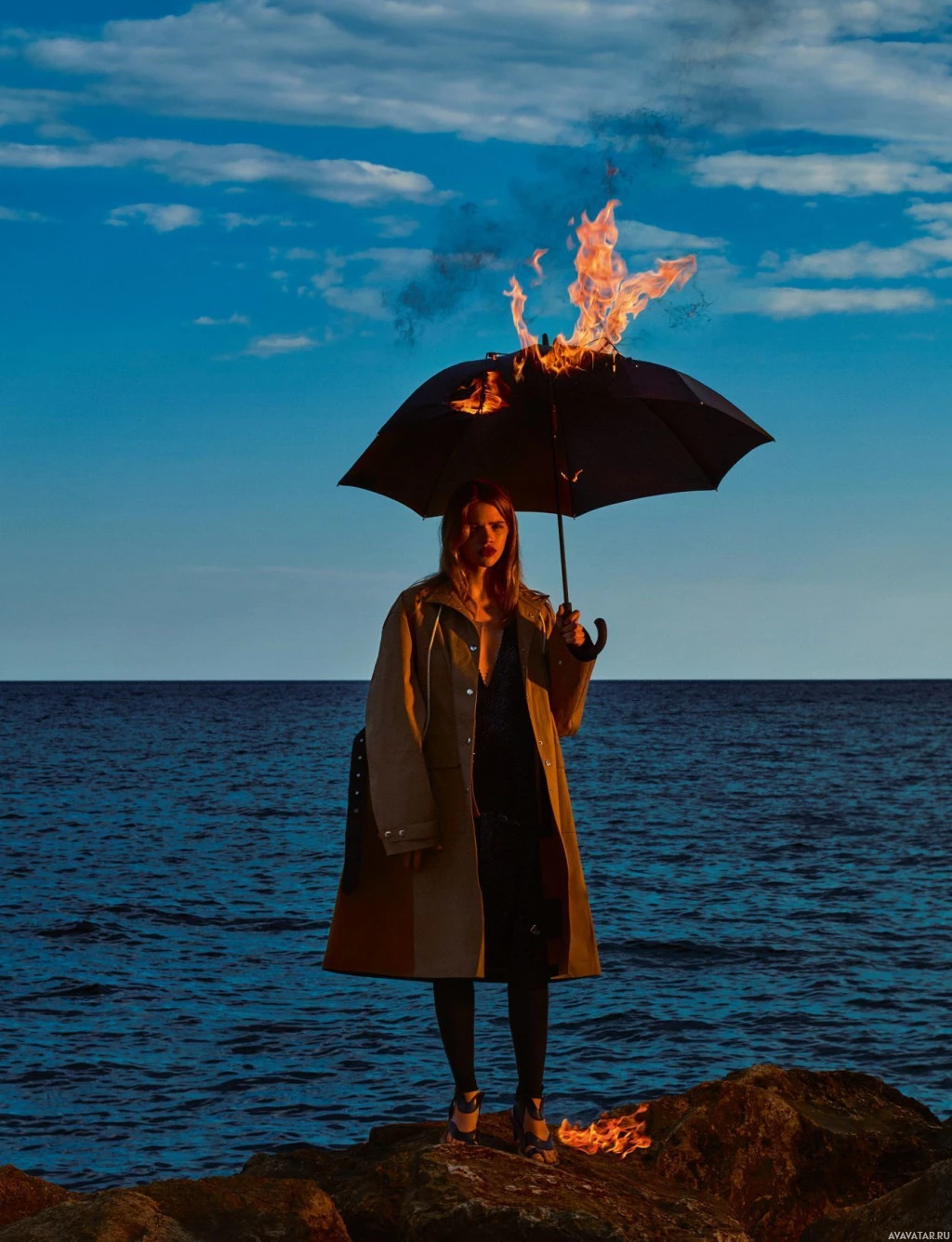 На картинке изображена женщина, стоящая на скалах у моря. Она держит зонтик, который, кажется, загорается от пламени у ее ног. Сцена имеет драматическое и сюрреалистическое качество, с контрастом между спокойствием моря и огненным разрушением перед ней.