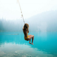 The picture shows a young woman hanging from a rope swing, known as a Tarzan rope. She is in mid-swing over water, which appears to be a lake based on its calmness and the presence of trees around it. The woman has blonde hair and is wearing a swimsuit or bikini. It's an outdoor scene with a natural setting that could be associated with recreational activities, such as swinging from a rope into a body of water for fun.