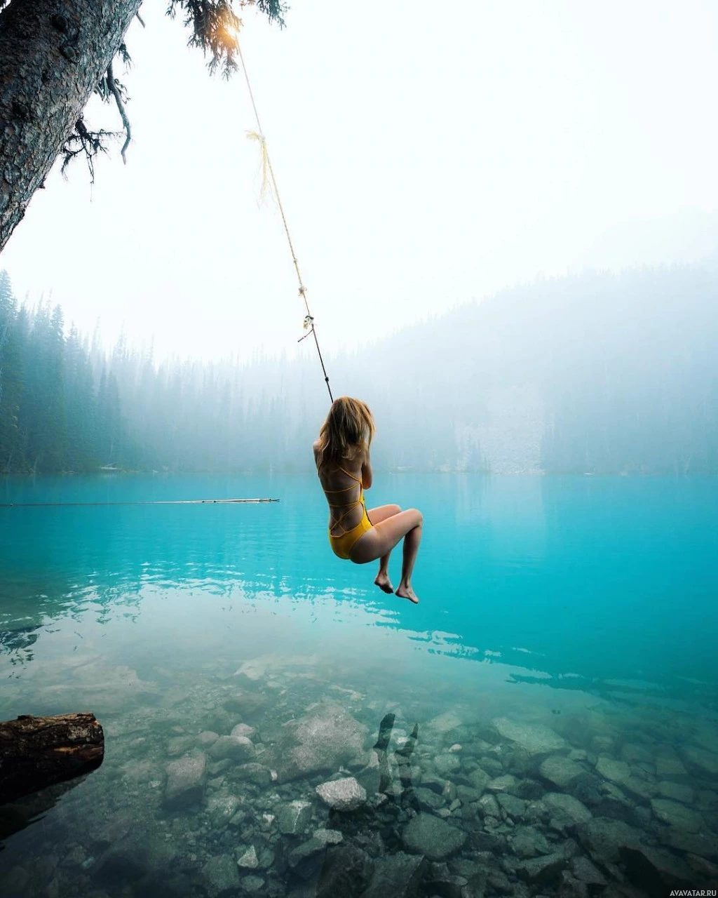 На снимке изображена молодая женщина, висевшая на качелях, известных как веревка Тарзана. Она находится в середине качения над водой, которая кажется озером, основанным на его спокойствии и присутствии деревьев вокруг него. Женщина имеет светлые волосы и носит купальник или бикини. Это наружная сцена с естественной обстановкой, которая может быть связана с рекреационными мероприятиями, такими как качание из веревки в водоем для развлечения.