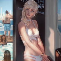 a beach setting, including sun loungers and people enjoying the water. The character is standing next to what appears to be a bar or refreshment stand. There are also some