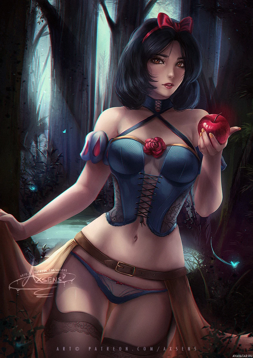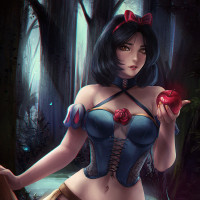 a glowing apple in one hand while the other hand rests on her hip. The background suggests a forest or woodland setting, adding to