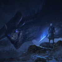 a rocky outcrop, looking towards a dragon that is perched nearby. The setting appears to be a cold and desolate environment, possibly in the North or beyond the Wall. The atmosphere suggests it could be during one of the show's