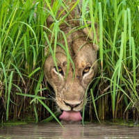 На картинке изображен лев, спрятанный в высокой траве на краю воды. Голова льва видна, когда он выходит из растительности, с открытым ртом и расширенным языком, вероятно, принимая напиток или охлаждаясь в воде.