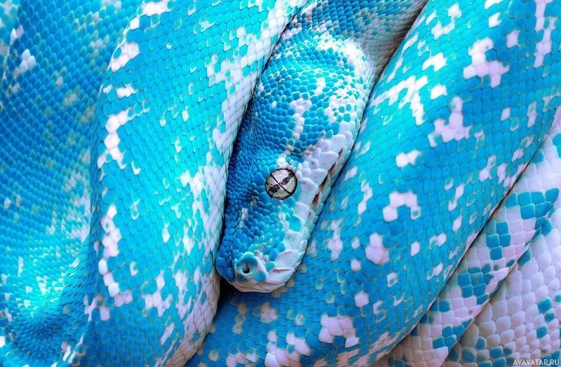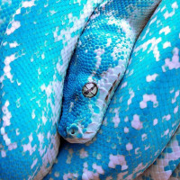 a ball python, which is known for its colorful scales. The scales are a vibrant blue with speckles and patterns that make it look quite stunning. The snake appears to be in